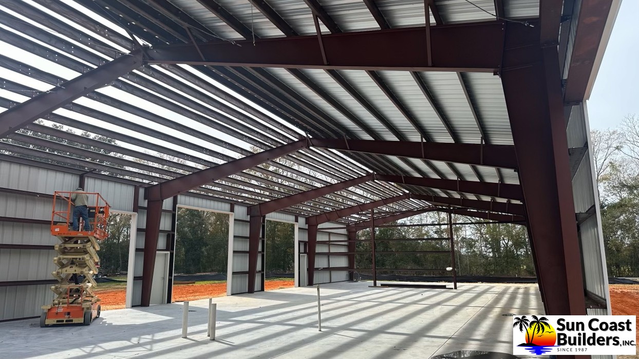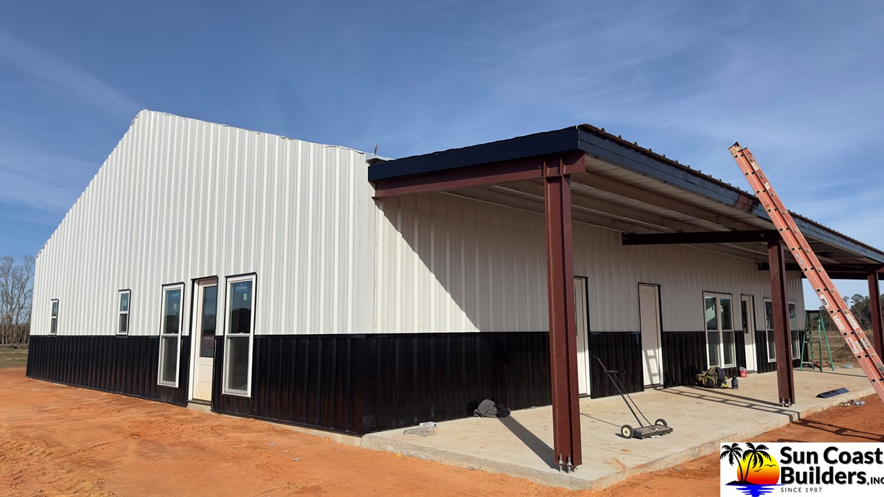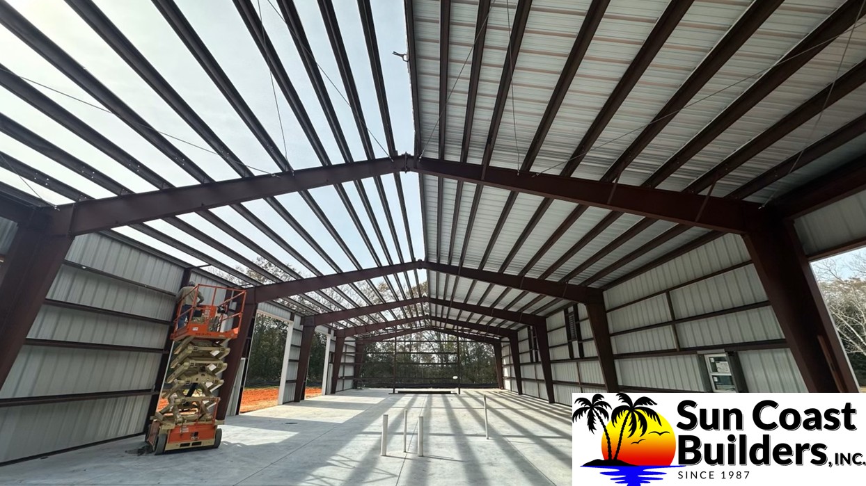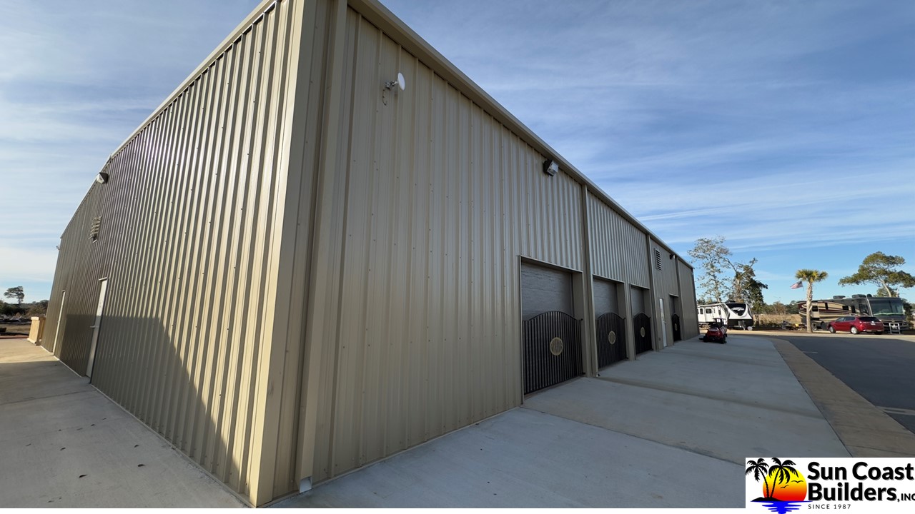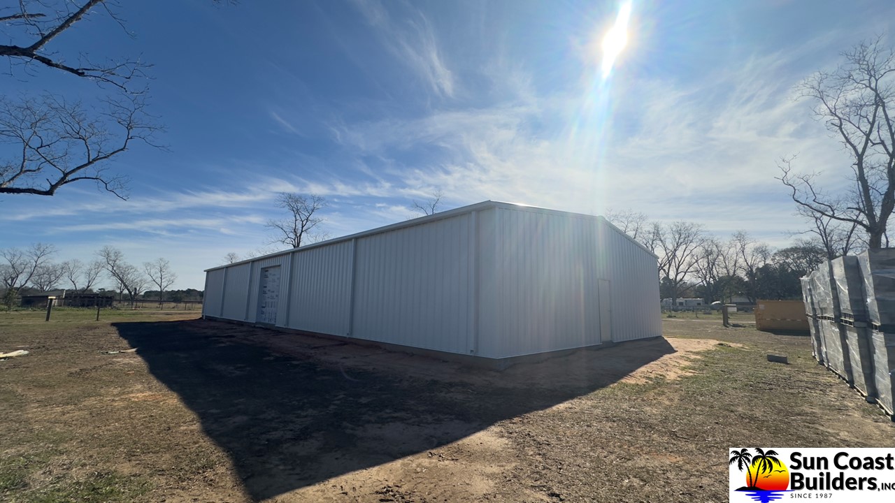 Sun Coast Builders erected a 60'x70' storage barn for me in late 2024 and everything turned out super nice. The roof overhang and trim added great touches to a solid building. The trim out around the shed roof section is tight and secure and minimizes openings keeping out nesting birds. After the building was complete I added interior walls for storage and to protect the metal building insulation.